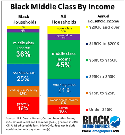 The following useful chart from Black Demographics shows that only 7% of us are in the upper middle and upper classes, compared to 16% of all groups. This is based on 2019 US Census data, which means it doesn’t account for the devastation brought by coronavirus and the protests nationwide that have shut down some businesses.