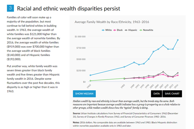 This October 2017 article asks the fundamental question: “Why hasn’t wealth inequality improved over the past 50 years? And why, in particular, has the racial wealth gap not closed?” It offers a series of graphics to illustrate how we’re stuck at the bottom in a big way. Here’s just one graphic with explanations along the left side: