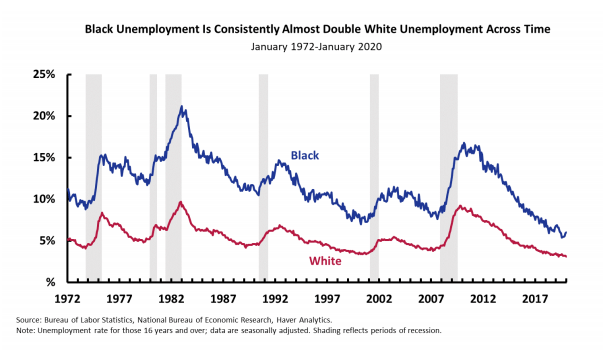 The U.S. economy provides Black Americans with far fewer opportunities for stable, wellpaying employment than their White counterparts. Over the past 50 years, the unemployment rate for Blacks consistently has been approximately twice that of Whites. Although President Trump in his recent State of the Union Address heralded the fact the Black unemployment rate had dropped to 6% in January 2020, it still is almost twice the White unemployment rate of 3.1%.[1]