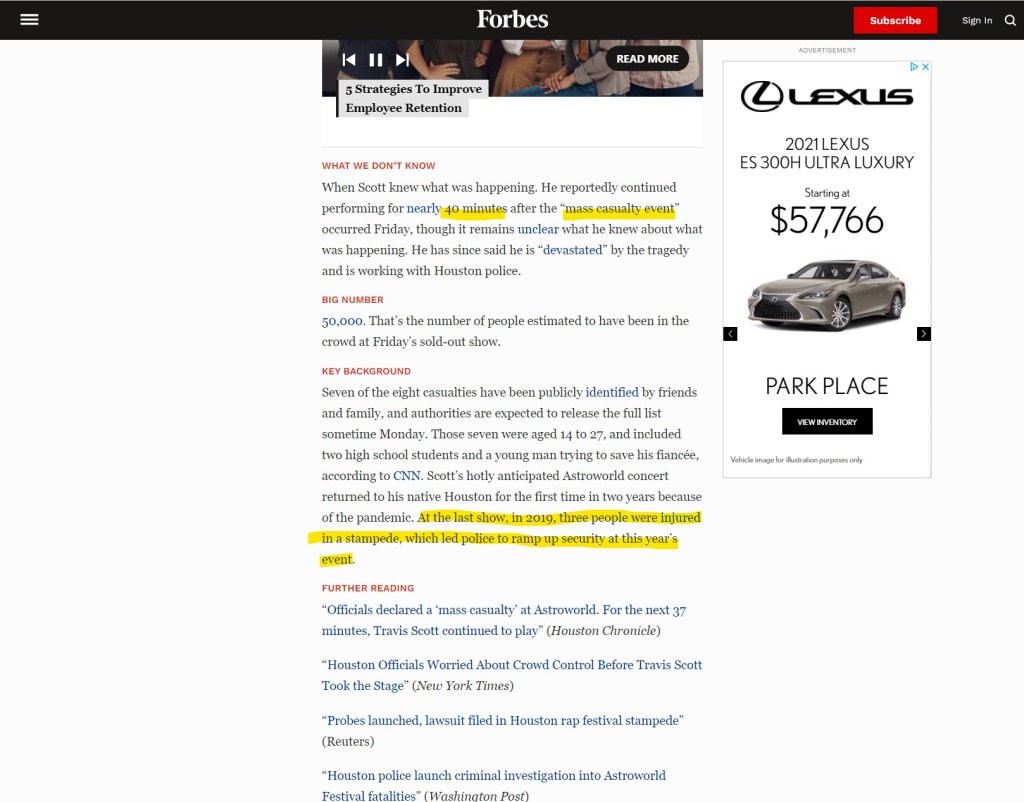 The business liability fallout following several deaths and hundreds of injuries will be enormous, especially given his history of neglecting concert safety measures by encouraging fans to rush the stage. That’s in addition to the fans rushing past security at the entrance gates. There’s no telling how many underage kids got past security. and with reports that some were injecting fans with illegal drugs without their knowledge, this could lead to considerable liability insurance problems that might put Live Nation and Ticketmaster in danger of bankruptcy. The same Forbes magazine I quoted earlier also said of his followers also said “Scott is a famously raucous MC. Once he takes the stage, fans are “ragers” (his term), and he is “La Flame” (ditto), the spark that sets it all off.” Clearly, the term “ragers” will now come back to haunt him legally and from a brand standpoint.