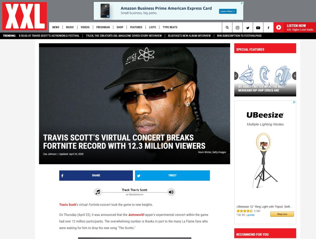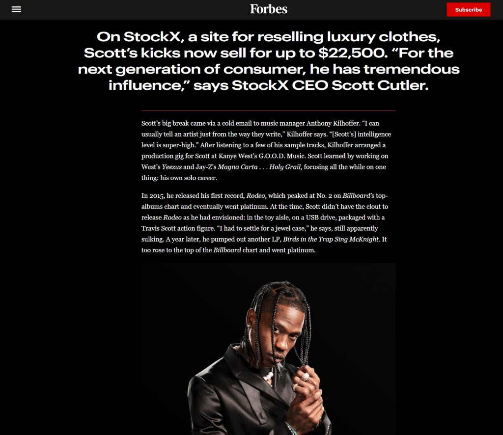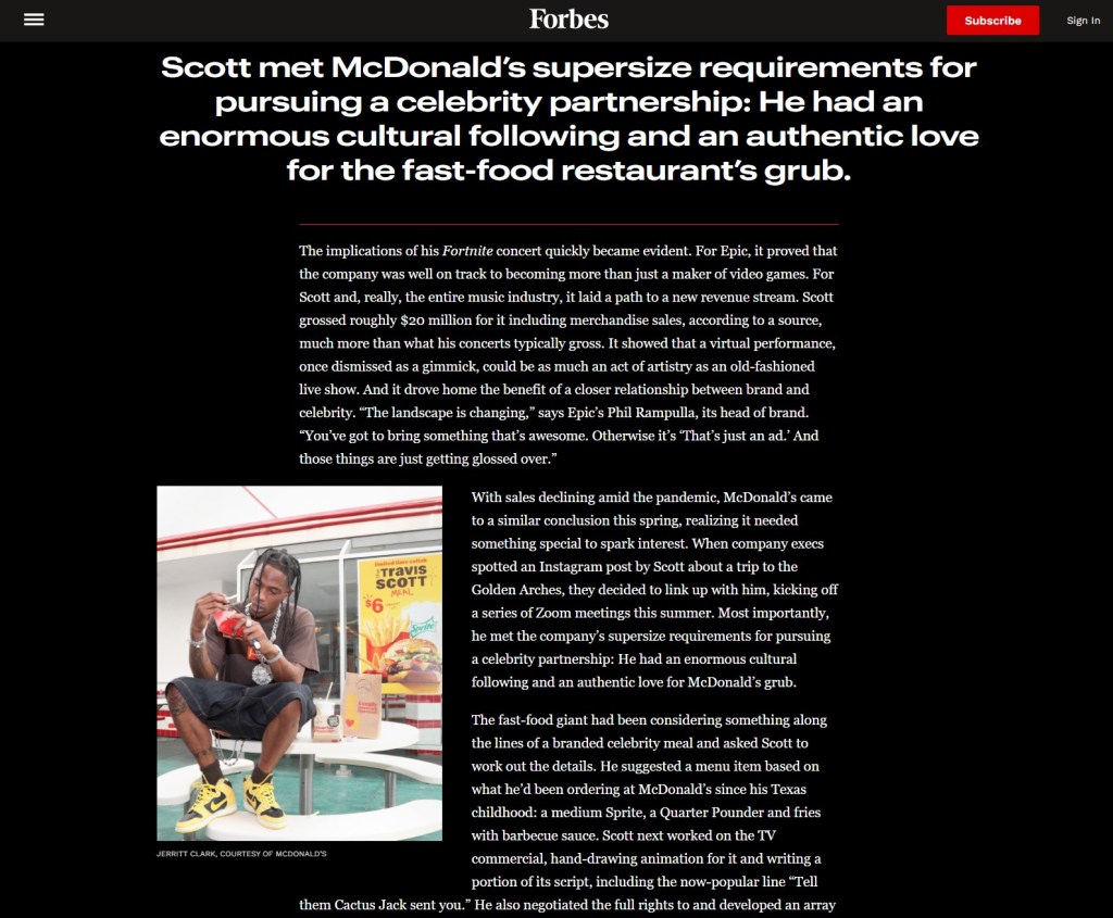 This deal led to a Cactus Jack line of food and merchandise. Right around the same time, Travis became a Strategic Creative Partner of PlayStation PS5 console. Earlier in 2020, as things began to shut down concerts, Travis Scott’s marketing brand reached an insanely impressive high following his virtual concert on the very popular Fortnite gaming platform. Over 12 million players logged in for it, calling it stunning and spectacular. Finally, Forbes Magazine in 2020 had him on pace to be worth over $100 million. Forbes fondly said of Travis “…he’s helping major companies rethink their brands—and changing how celebrities and corporations interact.”